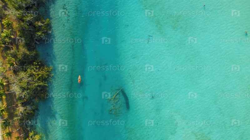 Воздух каяка скользит по чистой голубой воде вблизи зеленой тропической береговой линии