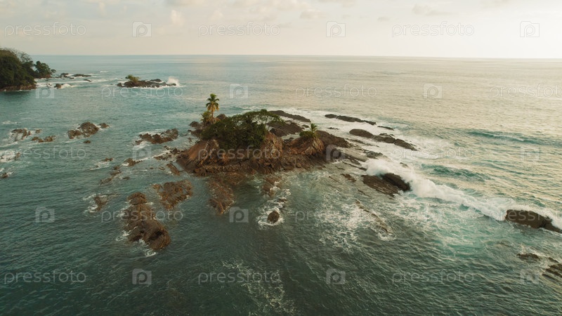 Небольшой скалистый остров, окруженный океанскими волнами на пляже Доминикалито в Коста-Рике