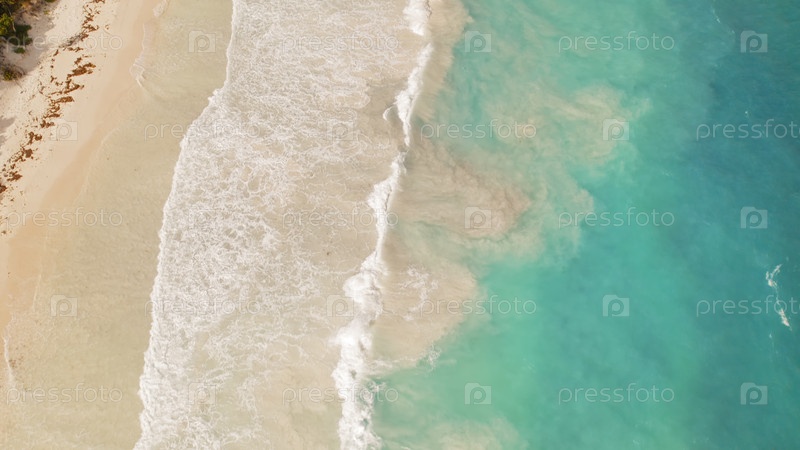 Морские волны ломаются на безмятежной тропической береговой линии с пальмами сверху