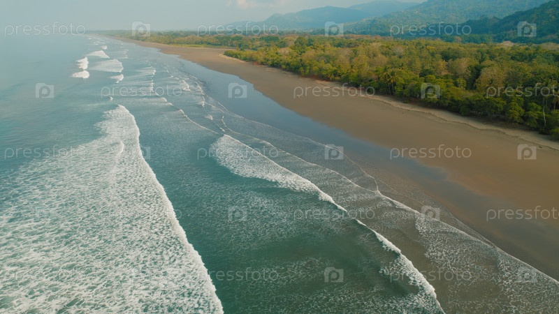 Океанские волны мягко катятся к пустому темному песчаному тропическому пляжу в Коста-Рике