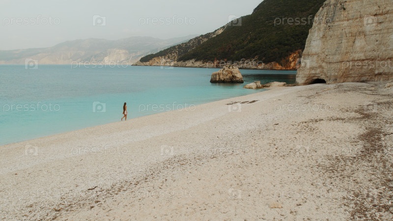 Одинокая женщина прогуливается по широкому галечному берегу, обрамленному скалами и бирюзовым морем