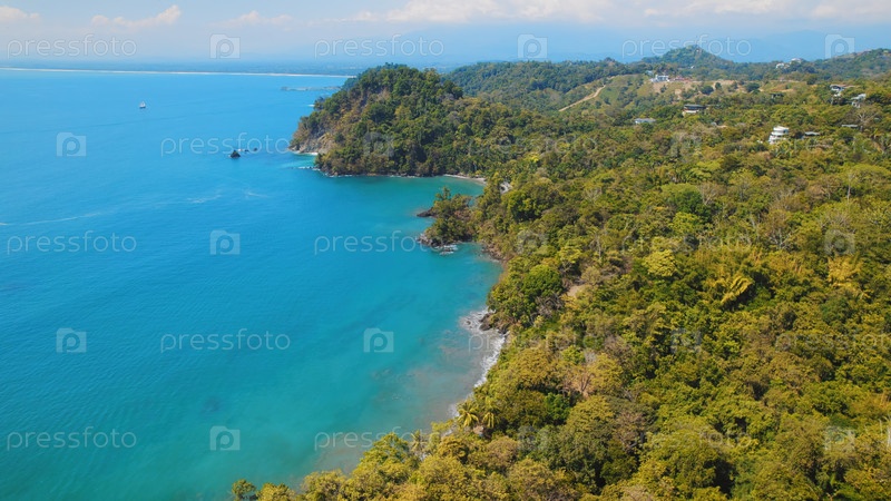 Клиффсайдский лес встречает бирюзовую океанскую воду в зеленом пышном тропическом Коста-Рике