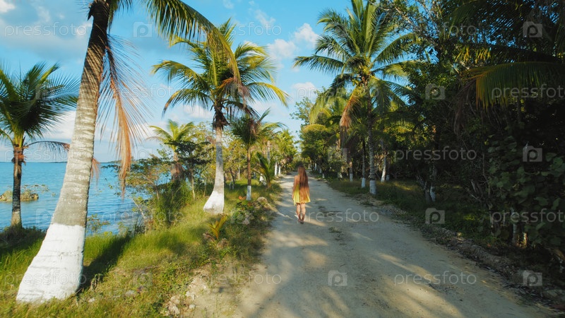 Женщина идет по грунтовой дороге с пальмами рядом с лагуной Бакалар в Мексике