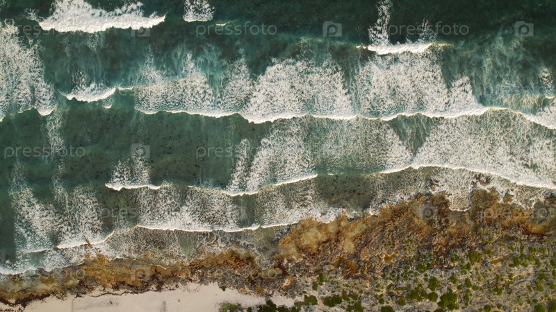 Приливные океанские волны обрушиваются на скалистый прибрежный риф с высоты птичьего полета