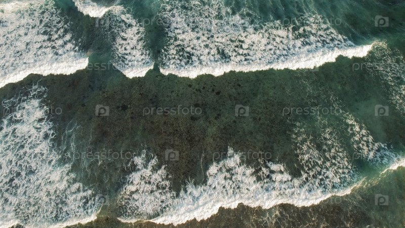 Вид с воздуха на волны, катящиеся по коралловому рифу под чистой тропической водой