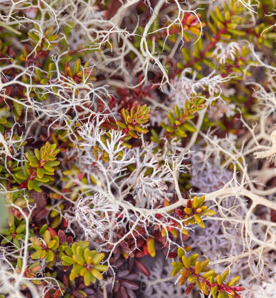 Яркий естественный узор мха и небольших суккулентов с белыми сухими ветвями. Красочные тундровые лишайники и ягоды