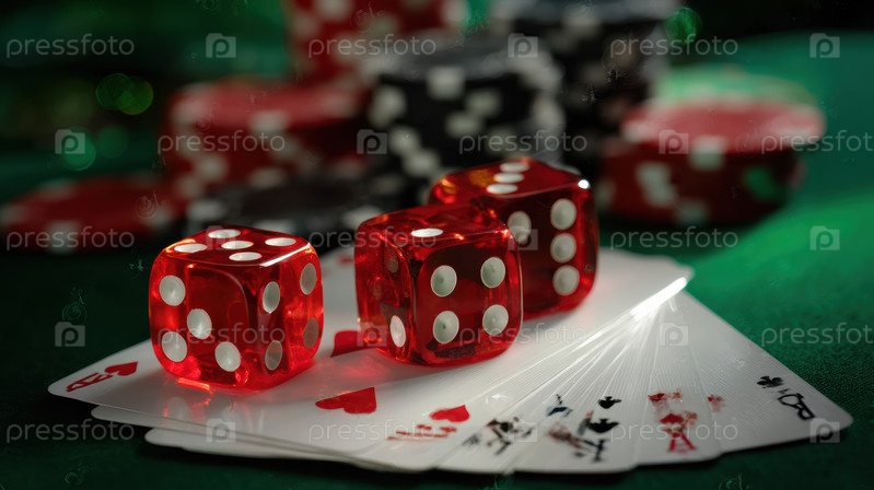 Яркое расположение красных костей и игральных карт на зеленом войлочном столе, идеально подходит для игровых тем