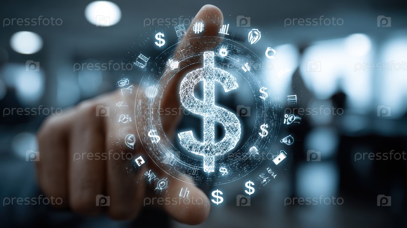 Цифровое взаимодействие, которое демонстрирует символ доллара, представляющий эволюцию современных финансов сегодня