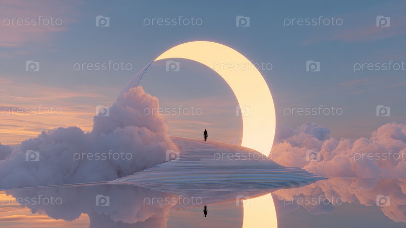Одинокая фигура на отражающей тропе, окруженная облаками и полумесяцем в мечтательном пейзаже