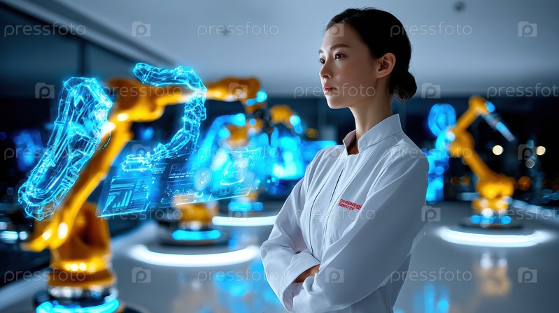 Специальный ученый тщательно оценивает передовые роботизированные технологии в высокотехнологичной исследовательской лаборатории