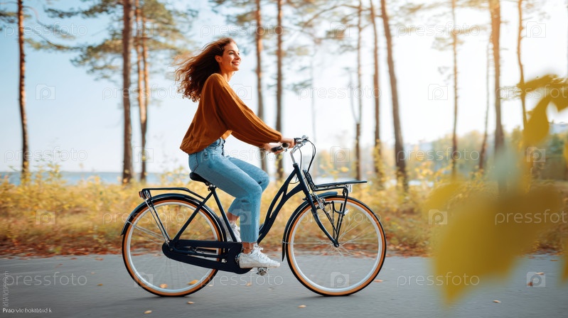 Женщина, едущая на велосипеде, радостно принимает тепло солнечного осеннего дня, когда она плетется сквозь деревья