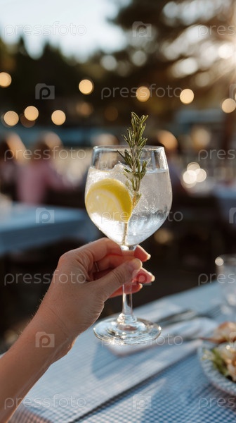 Насладитесь освежающим напитком из лимонада, подаваемым в стильном стакане, в комплекте с красивым гарниром сверху