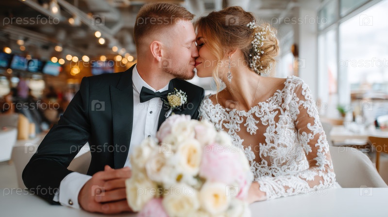 Потрясающе красивая пара, разделяющая глубоко романтический поцелуй во время их радостного свадебного торжества