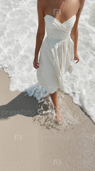 Изящная женщина в белом платье прогуливается по песчаному берегу, волны мягко хлопают у ее босых ног