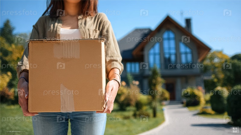 Женщина с радостью получает упаковку в своем доме с красивым и привлекательным домом на заднем плане