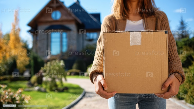 Женщина радостно держит пакет доставки перед очаровательным домом, демонстрируя услугу доставки на дом