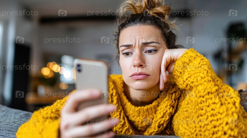 Молодая женщина, одетая в уютный желтый свитер, выглядит довольно обеспокоенной, используя свой смартфон дома