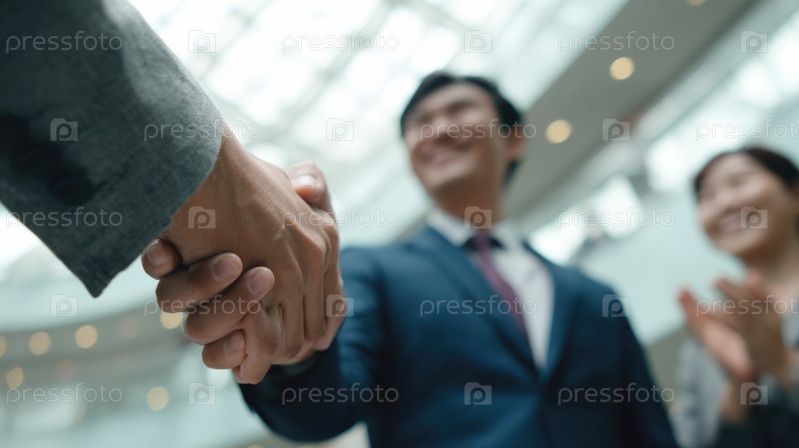 Рукопожатие происходит в современной офисной среде, что означает сотрудничество и доверие