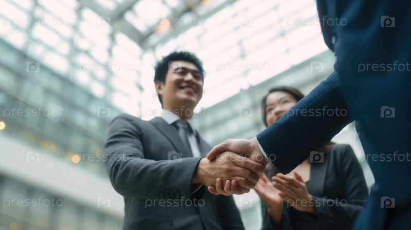 Рукопожатие происходит в современной офисной среде, что означает сотрудничество и доверие