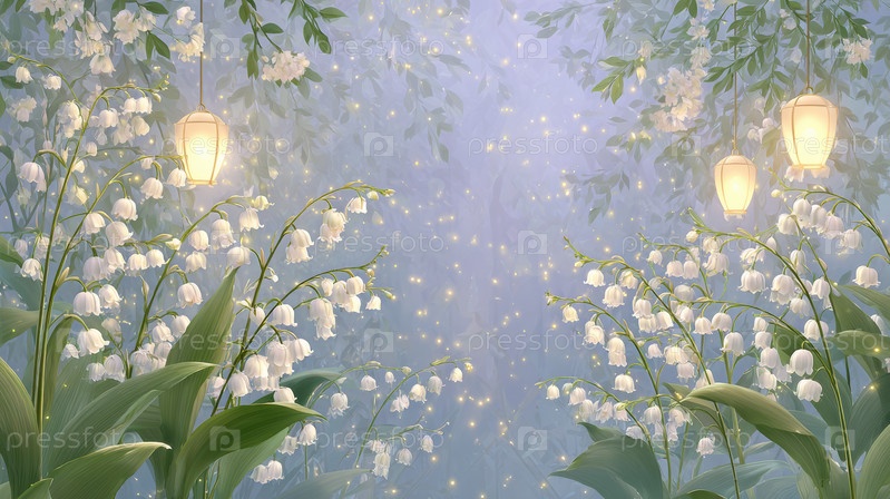 Завораживающий Зачарованный Лес, заполненный Сияющей Лилией Цветов Долины, установленный в туманной атмосфере, подобной сну