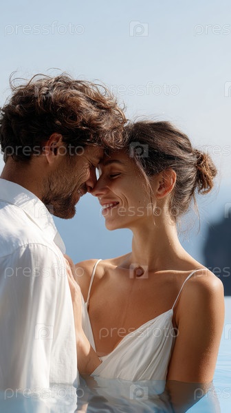 Красивая романтическая пара радостно обнимает друг друга в безмятежной и блаженной воде лета