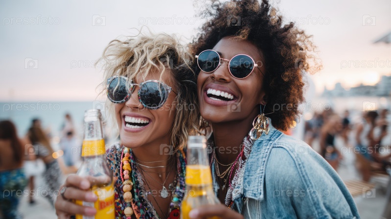 Радостные друзья, которые с удовольствием пьют свежевыжатые напитки Расслабляясь на прекрасном пляже