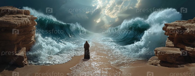 Драматическая пляжная сцена, демонстрирующая высокие волны, свирепо разбивающиеся, в то время как одинокая фигура стоит в глубоком созерцании