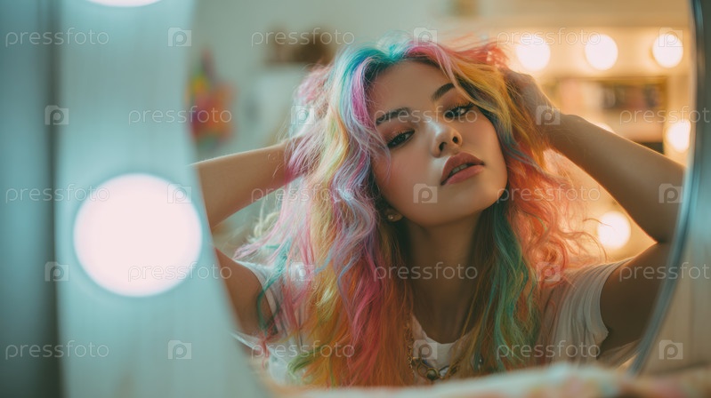 Молодая и яркая женщина гордо демонстрирует свои ослепительные радужные волосы в шикарном и стильном зеркале тщеславия