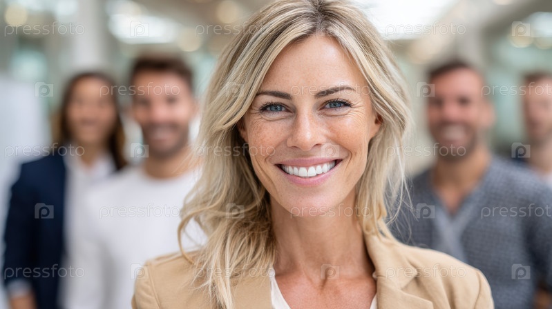 Уверенная в себе бизнесвумен, сияюще улыбающаяся в яркой и привлекательной офисной среде, полной энергии и жизни