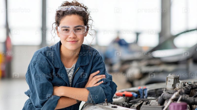 Молодая женщина-механик гордо улыбается в магазине авторемонта в вдохновляющей и разнообразной рабочей среде