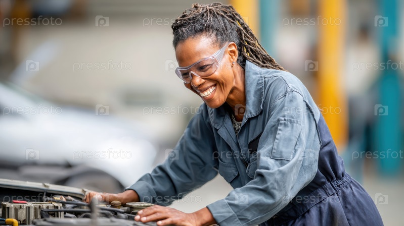Молодая женщина-механик гордо улыбается в магазине авторемонта в вдохновляющей и разнообразной рабочей среде
