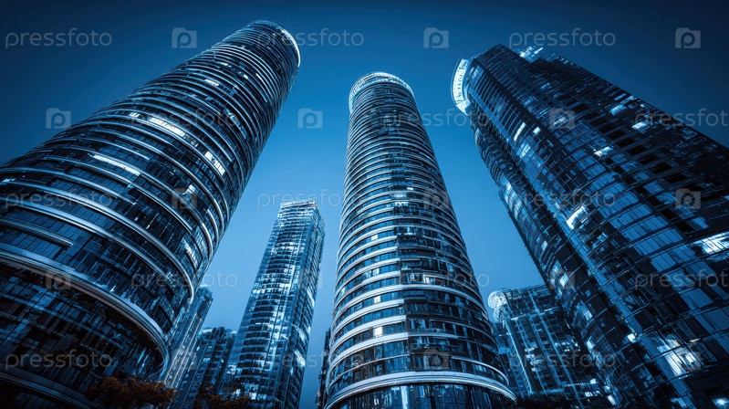 Современные небоскребы Потрясающие светоотражающие стеклянные фасады на фоне ясного голубого неба в городском ландшафте