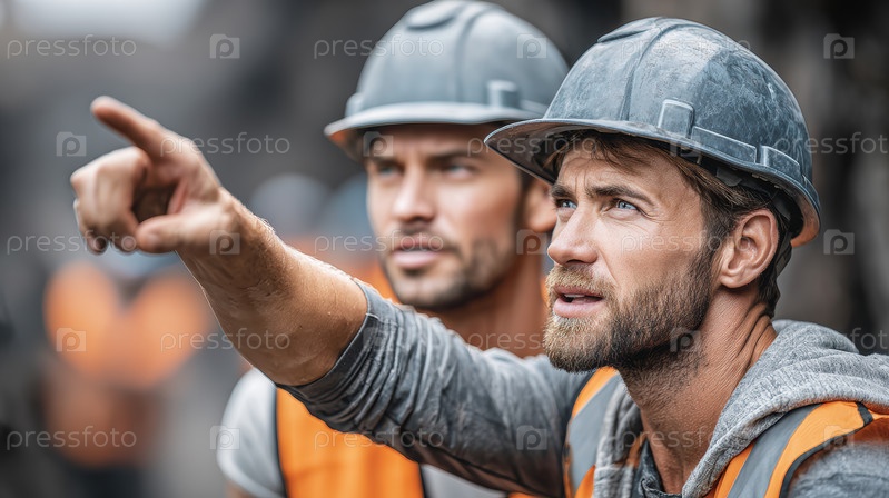 На шумной строительной площадке двое рабочих в жестких шляпах обсуждают свои текущие проектные задачи