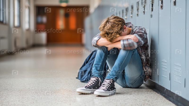 Одинокий студент сидит один в пустом школьном коридоре, показывая глубокое чувство изоляции и безнадежности