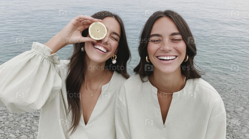 Два радостных друга радостно позируют у прекрасной воды, демонстрируя свою дружбу и счастье