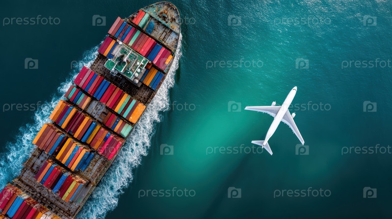 Грузовое судно и самолет, работающие в оживленной портовой среде с различными коммерческими мероприятиями