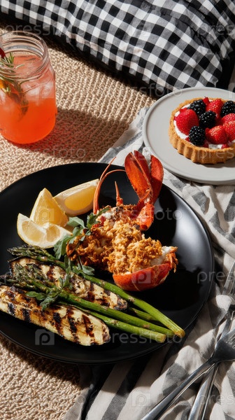 Побалуйте себя восхитительным жареным омаром в сопровождении свежих овощей и восхитительного десерта Берри Тарта