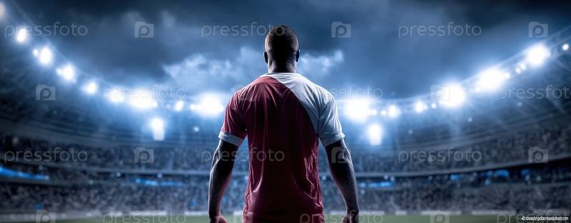 Решительный футболист готов к действию на ярком стадионе, полностью освещенном сияющими огнями