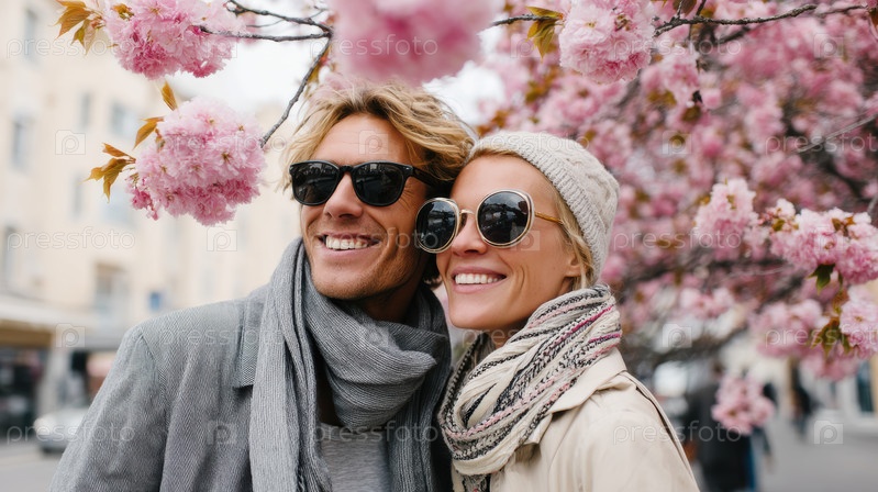 Счастливая и веселая пара, наслаждающаяся прекрасными весенними цветами в красивом городском парке вместе