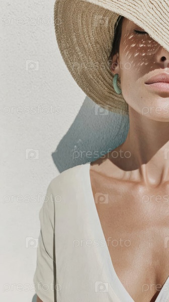 Шикарное летнее изображение с моделью в солнечной шляпе и элегантном наряде, захватывающее расслабленные вибрации