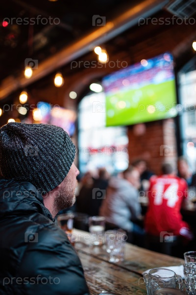 Зритель полностью погрузился в электрифицирующую атмосферу оживленного футбольного матча в оживленном баре с друзьями