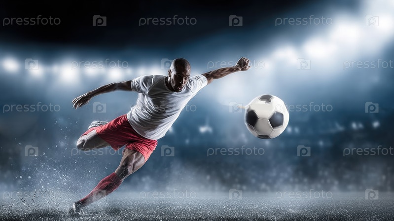 В захватывающей атмосфере матча опытный футболист выполняет впечатляющий удар, демонстрируя свой талант