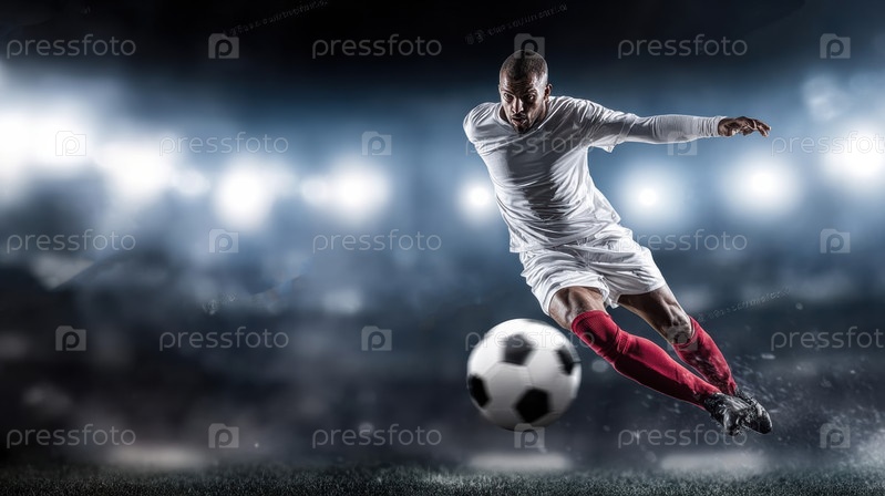 Захватывающий динамичный футболист умело пинает мяч на потрясающем стадионе в ярком центре внимания