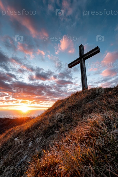 Красивый закат бросает теплое свечение за крестом на холме, символизируя мир, надежду и духовность