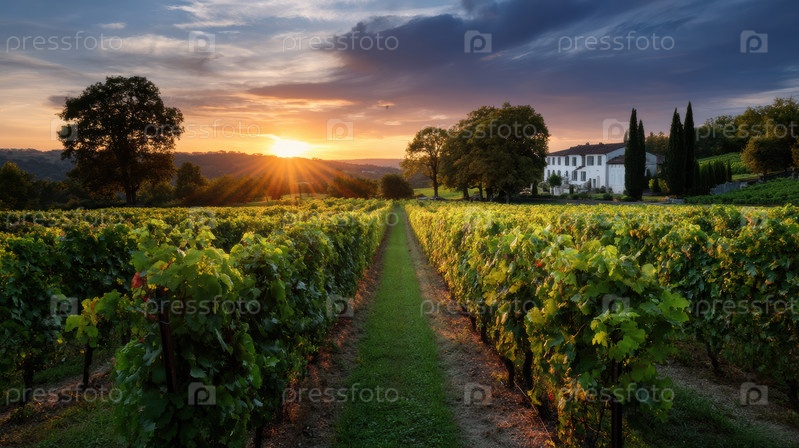 Потрясающий красивый виноградник на закате, с пышными виноградниками и живописным пейзажем вокруг