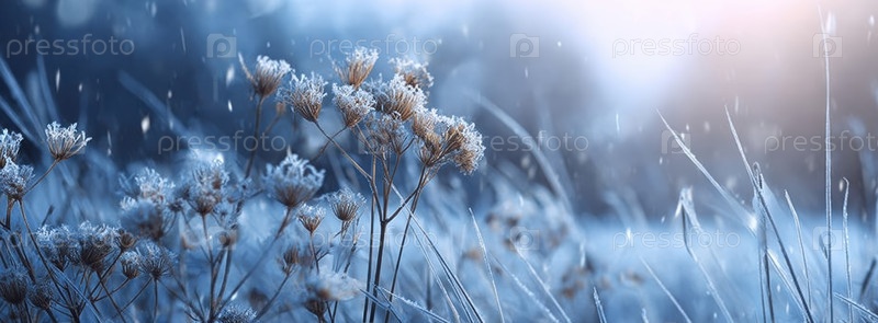 Красивый морозный утренний сияние освещает нежные цветы в поле