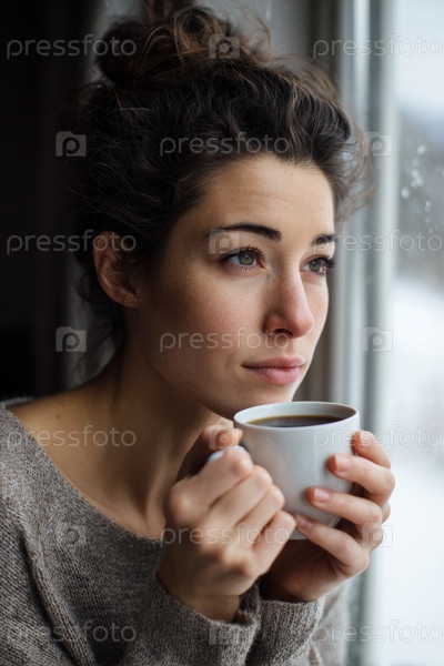 Женщина, любующаяся яркостью рассвета, юная леди, наслаждающаяся мягким утренним солнечным светом в помещении, Молодая женщина отдыхает с теплым напитком, размышляя в спокойной домашней обстановке