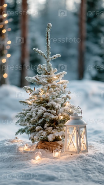 Замороженный сосновый праздник, Уютная зимняя лесная сцена, миниатюрная пихта, освещенная праздничными огнями, серенные заснеженные деревья, купающиеся в нежной атмосфере свечей