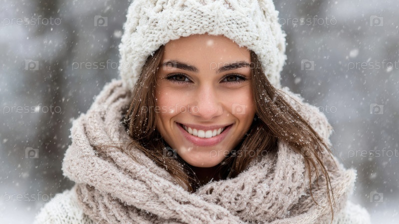 Веселый зимний стиль на открытом воздухе, расслабленная женщина, тепло одетая в снежный пейзаж, случайная леди, наслаждающаяся зимними пейзажами на открытом воздухе с сезонными аксессуарами и естественным освещением