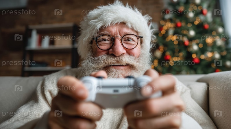 Пожилой кавказский мужчина, держащий контроллер, белую бороду и круглые очки, одетый в праздничный свитер, улыбающийся в уютной гостиной возле украшенной елки,